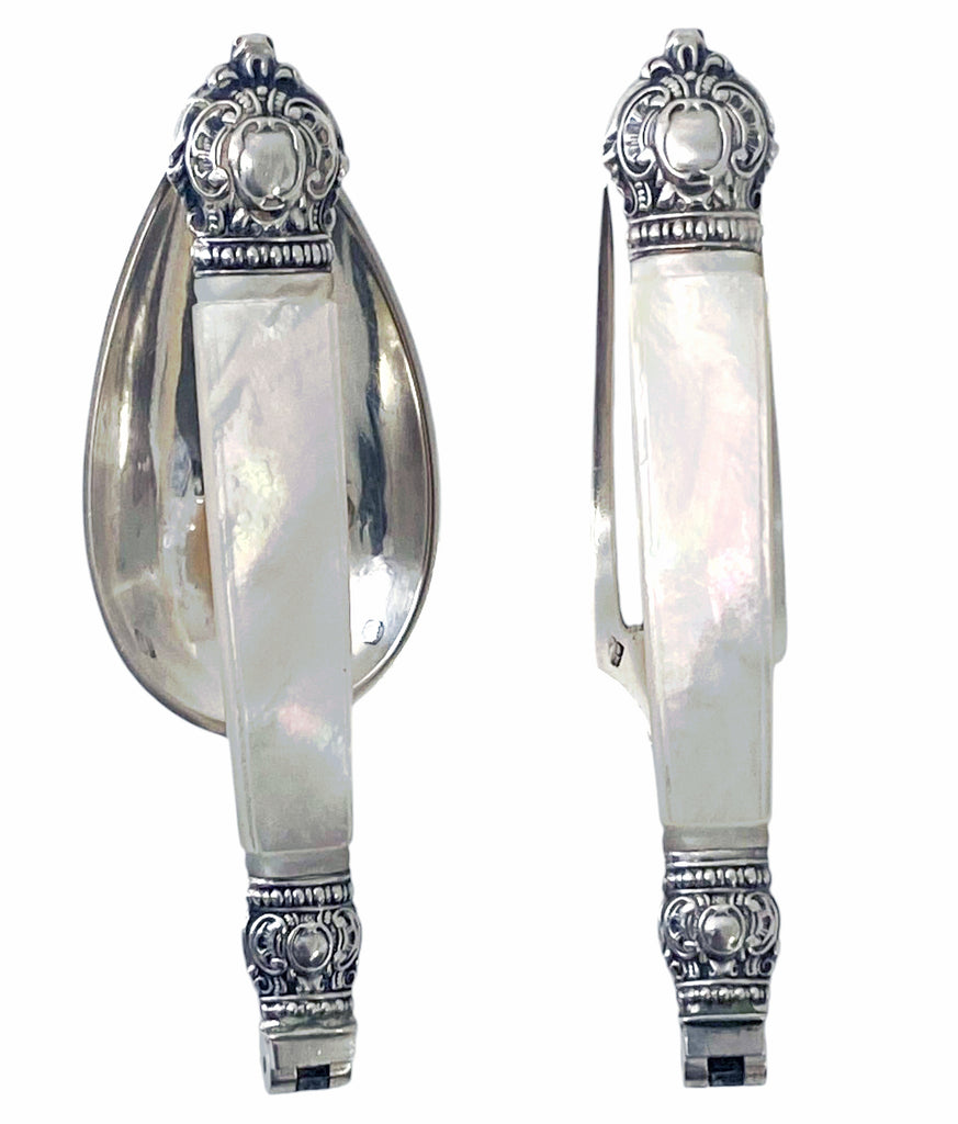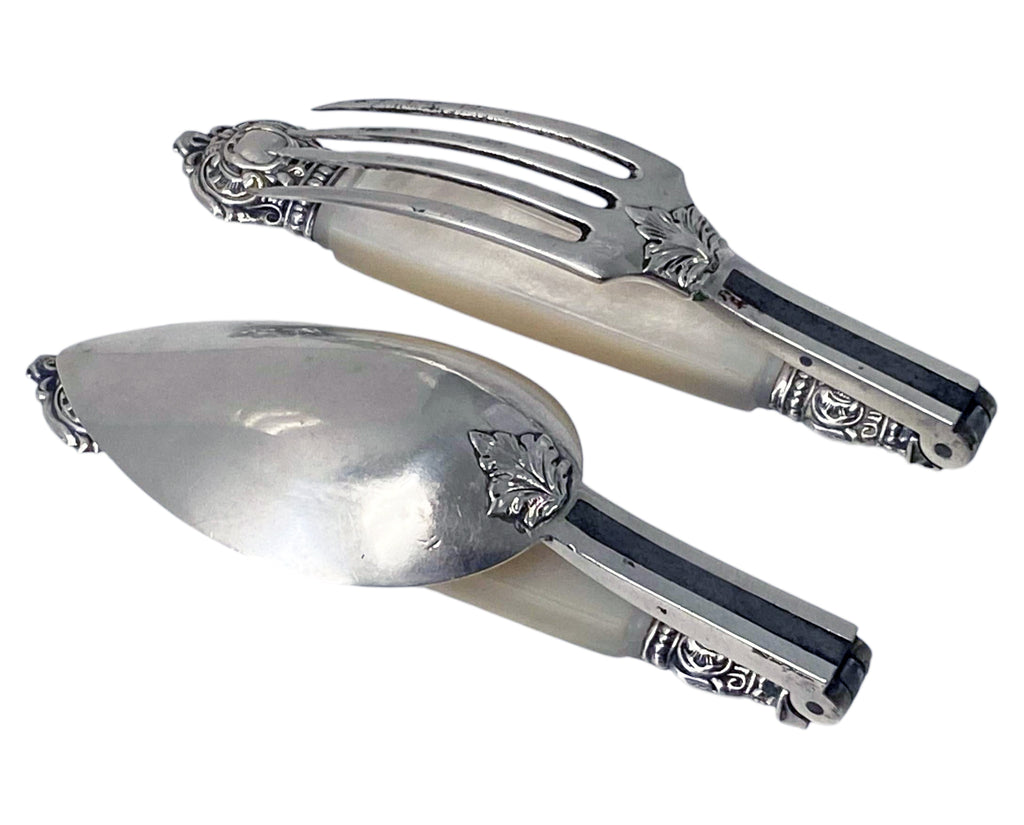 Rare Antique French antique silver travel folding fork and spoon set with mother of pearl handles, France C. 1880. Contained in original fitted wooden case (key included but lock not working) spoon extended length 7.7 inches, fork extended length 7.5 inches. Condition: Good. Extreme minor wear mentioned purely for accuracy purposes only. Reflections from photography only, mother of Pearl handles, no chips or wear. Makers mark in lozenge and Minerva mark.