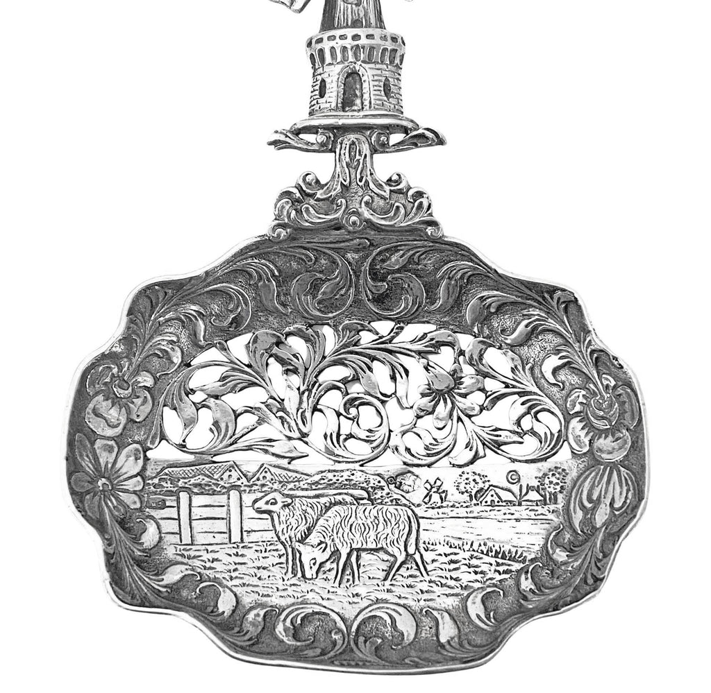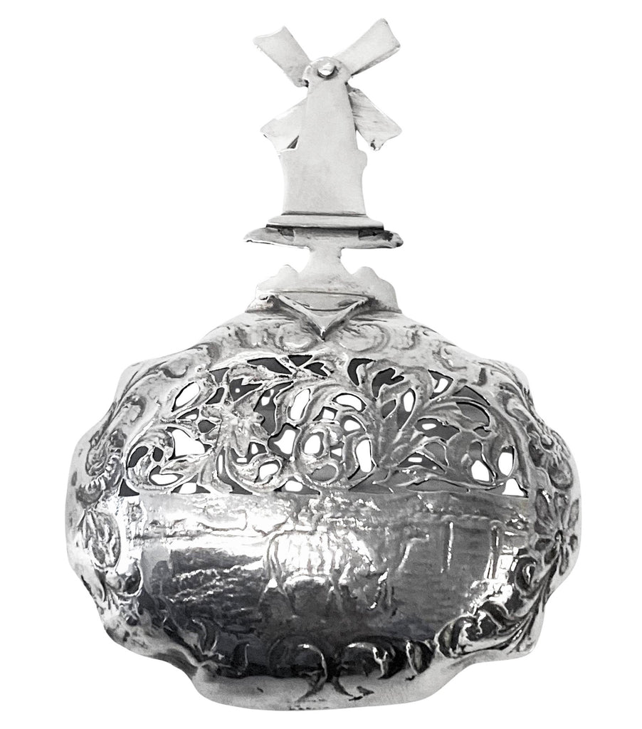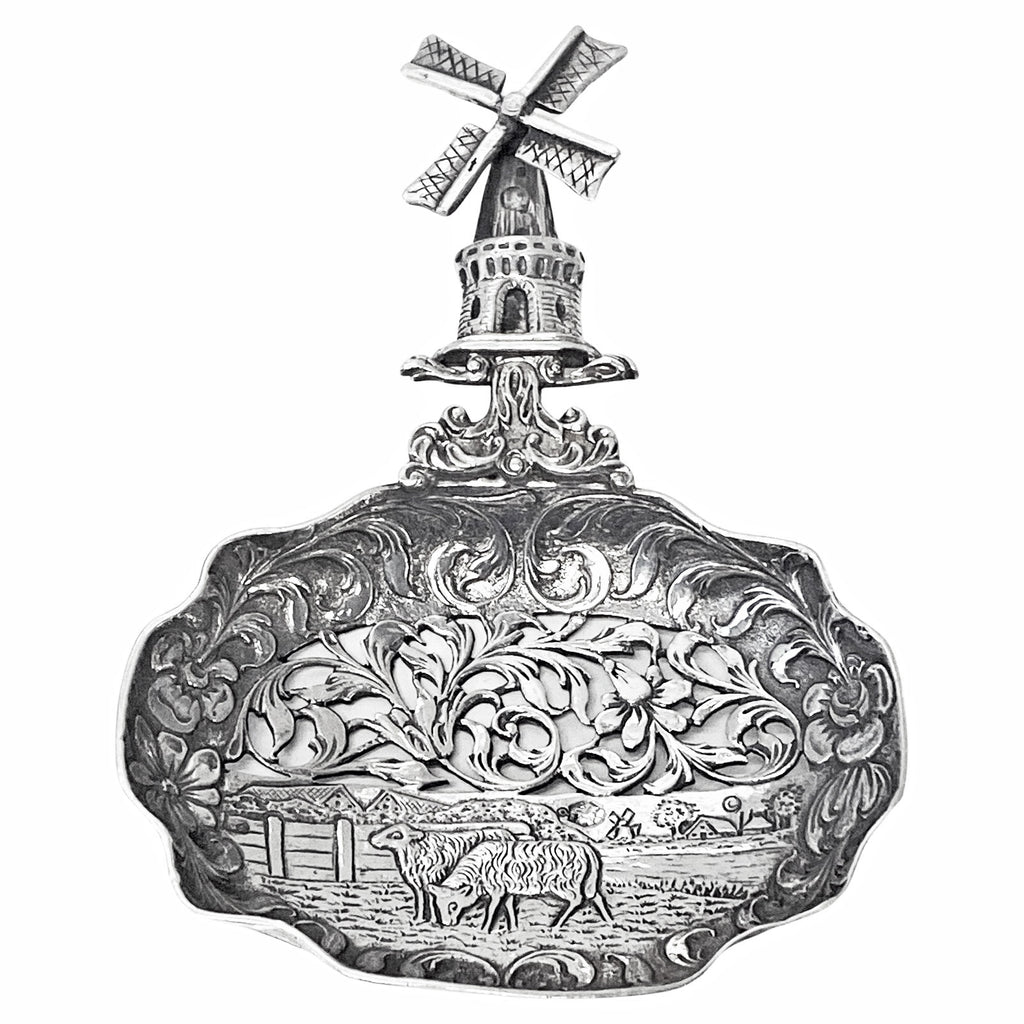 Dutch pierced and repousse preserve sifter silver spoon Groningen 1912. Superb silversmithing depicting a windmill and farmyard scene with cows grazing. Marked in bowl with 1912 date letter C, Silver lion passant standard mark for 0.833, export key mark and maker’s mark. The handle with Minerva mark and E for Groningen, the windmill with sword mark. Length: 4.50 inches. Width of bowl: 3.00 inches. Weight: 50.46 grams. Condition: Good. Reflections purely from photography only.