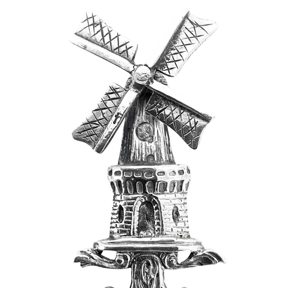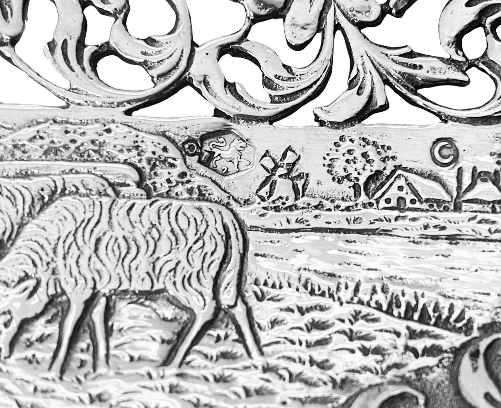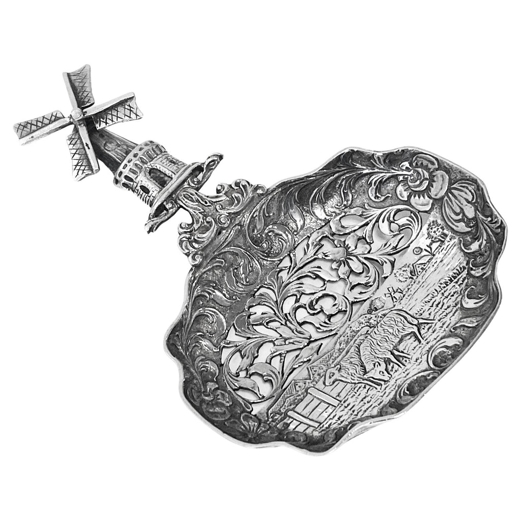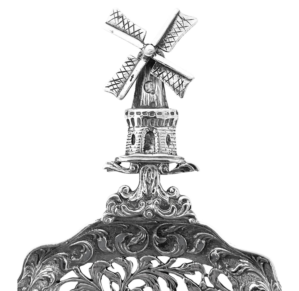 Dutch pierced and repousse preserve sifter silver spoon Groningen 1912. Superb silversmithing depicting a windmill and farmyard scene with cows grazing. Marked in bowl with 1912 date letter C, Silver lion passant standard mark for 0.833, export key mark and maker’s mark. The handle with Minerva mark and E for Groningen, the windmill with sword mark. Length: 4.50 inches. Width of bowl: 3.00 inches. Weight: 50.46 grams. Condition: Good. Reflections purely from photography only.